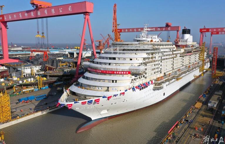 2019年10月18日,郵輪鋼板開始切割,首制大型郵輪進入實質建造階段。到2020年11月,2號船塢擴建完工五個月后,首制大型郵輪正式轉入塢內進行連續搭載。次年底,白色巨輪實現全船貫通,在塢內起浮當天,造船廠的工人們興奮地以水門儀式慶祝,郵輪工程轉段進入內裝和系統完工調試的“下半場”。