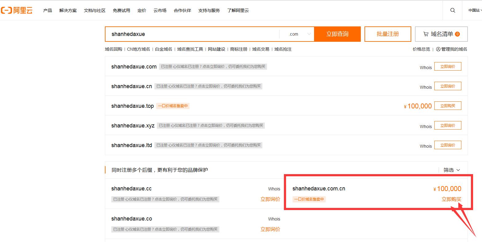 我們通過國內(nèi)知名互聯(lián)網(wǎng)服務商阿里云平臺查詢到目前shanhedaxue.com shanhedaxue.cn等均以被注冊,更有像shanhedaxue.com.cn這樣的域名一口價10萬元,目前來看搶注此域名意義不大,要想建立這樣的一個實際大學不是一個簡單的事情,這種投機行為有一定的成功率,我們也希望真的有一所這樣大學出現(xiàn)。