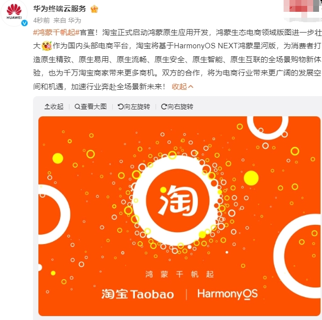 1 月 25 日消息,今日淘寶與華為舉辦鴻蒙合作簽約儀式,宣布將基于 HarmonyOS NEXT 啟動鴻蒙原生應用開發。